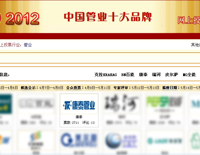 圖為康泰塑膠科技集團(tuán)獲2012年中國(guó)管業(yè)十大品牌評(píng)選網(wǎng)頁(yè)