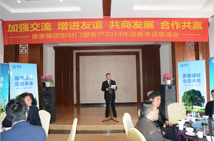 ??? 當日,以“加強交流、增進友誼、共商發(fā)展、合作共贏”康泰集團型材門窗客戶2014年迎春茶話聯(lián)誼會在美麗的街子古鎮(zhèn)味江味花園飯店隆重召開,一百多名客戶參加了此次聯(lián)誼會,集團公司林總裁、品牌總監(jiān)鄭光鏵、型材事業(yè)部總經(jīng)理陳彪出席本次聯(lián)誼會。